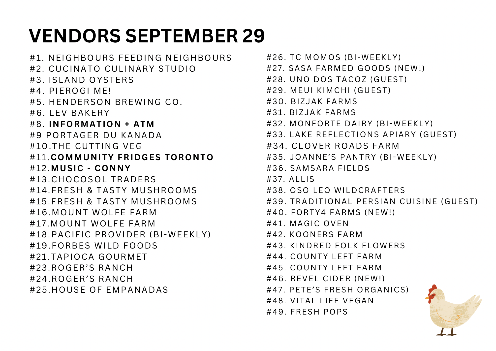 This year we will be partnering with Community Fridges Toronto, Sistering and the Bike Brigade. Please consider purchasing some fresh produce from our farmers and leaving this at our Gratitude/Donation table near the info desk.